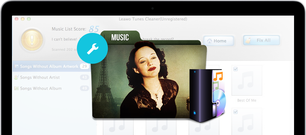 內部獨特的評分系統 Leawo Tunes Cleaner for Mac 可以在清理之前和之後自動對人們的音樂庫進行評分。只需 3 個步驟即可修復音樂文件,即可獲得 100 個 iTunes 庫。