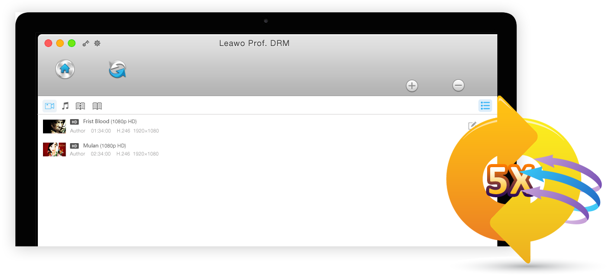 憑藉先進的加速技術, Leawo Prof. DRM for Mac 能夠從 iTunes M4V 影片(電影和電視節目)、M4P 音樂、M4B 有聲書和 Audible AA、AAX 有聲讀物中刪除 DRM 保護,並將 M4V 轉換為 MP4,將 M4P/M4B/AA/AAX 轉換為 MP3 在 Mac 上以 5 倍的速度運行,並 100% 保留原始品質。