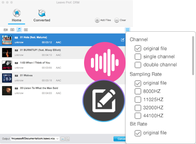 Leawo Prof. DRM for Mac 允許使用者在 Mac 上解密和轉換 iTunes DRM 影片之前輸出多個音軌和字幕。它還允許用戶為輸出選擇不同的聲道、取樣率和位元率 MP3 用於在 Mac 上轉換 iTunes DRM 音樂、有聲書和 Audible 有聲書的檔案。