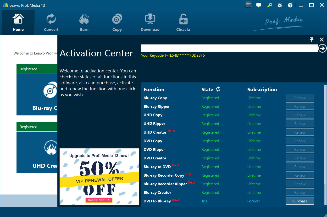 購買後,您將獲得註冊碼進行註冊 Leawo UHD轉檔器。註冊產品後,即可立即不受任何限制地使用該產品。